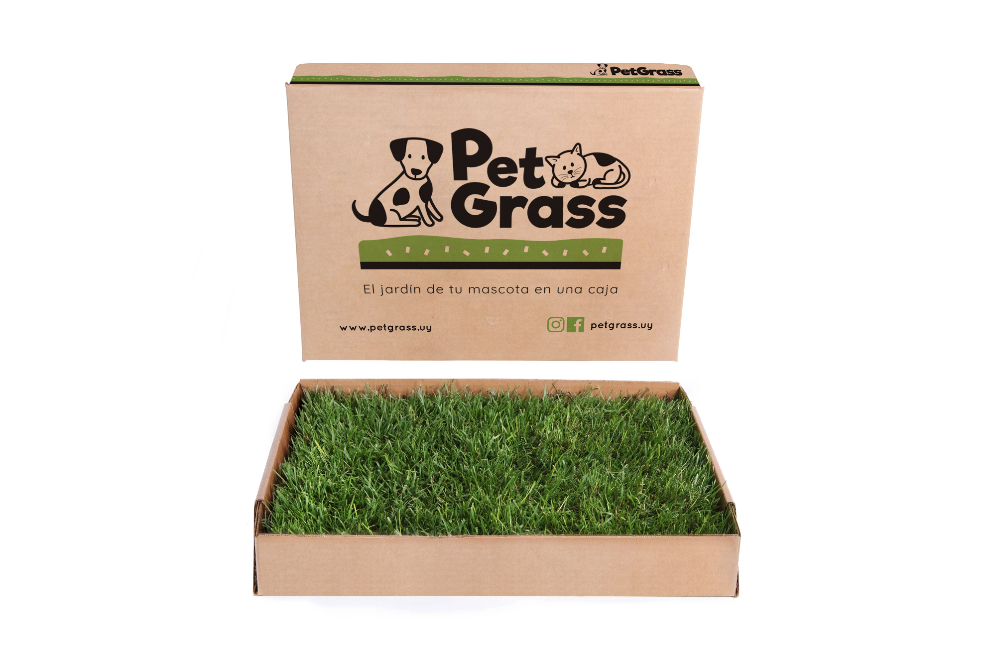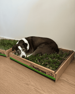 PetGrass es césped 100% natural cultivado, presentado en una caja de cartón resistente con base impermeable (sin plástico), diseñado especialmente para que tu perro tenga su propio espacio donde hacer sus necesidades de forma instintiva, cómoda y segura.